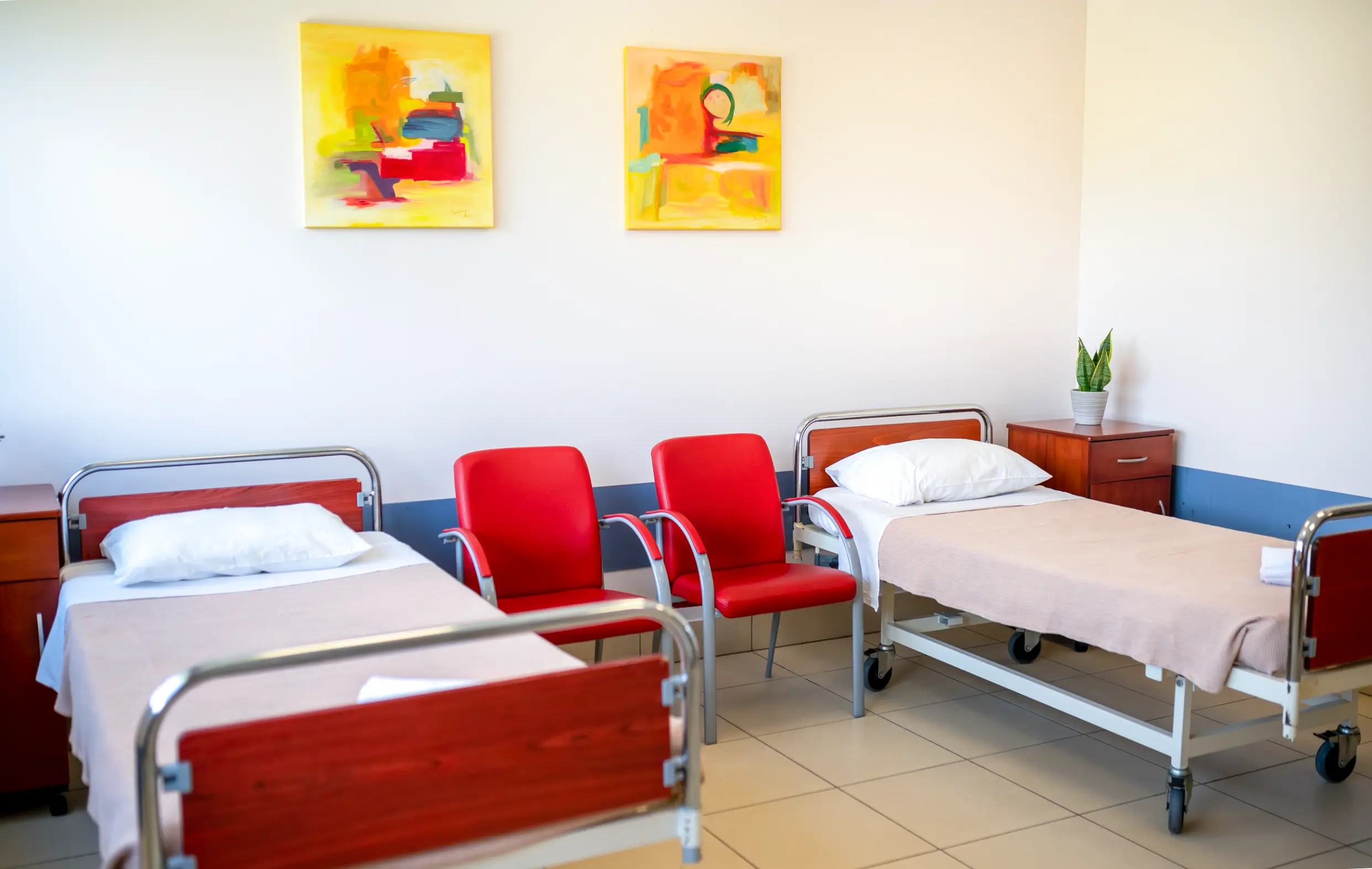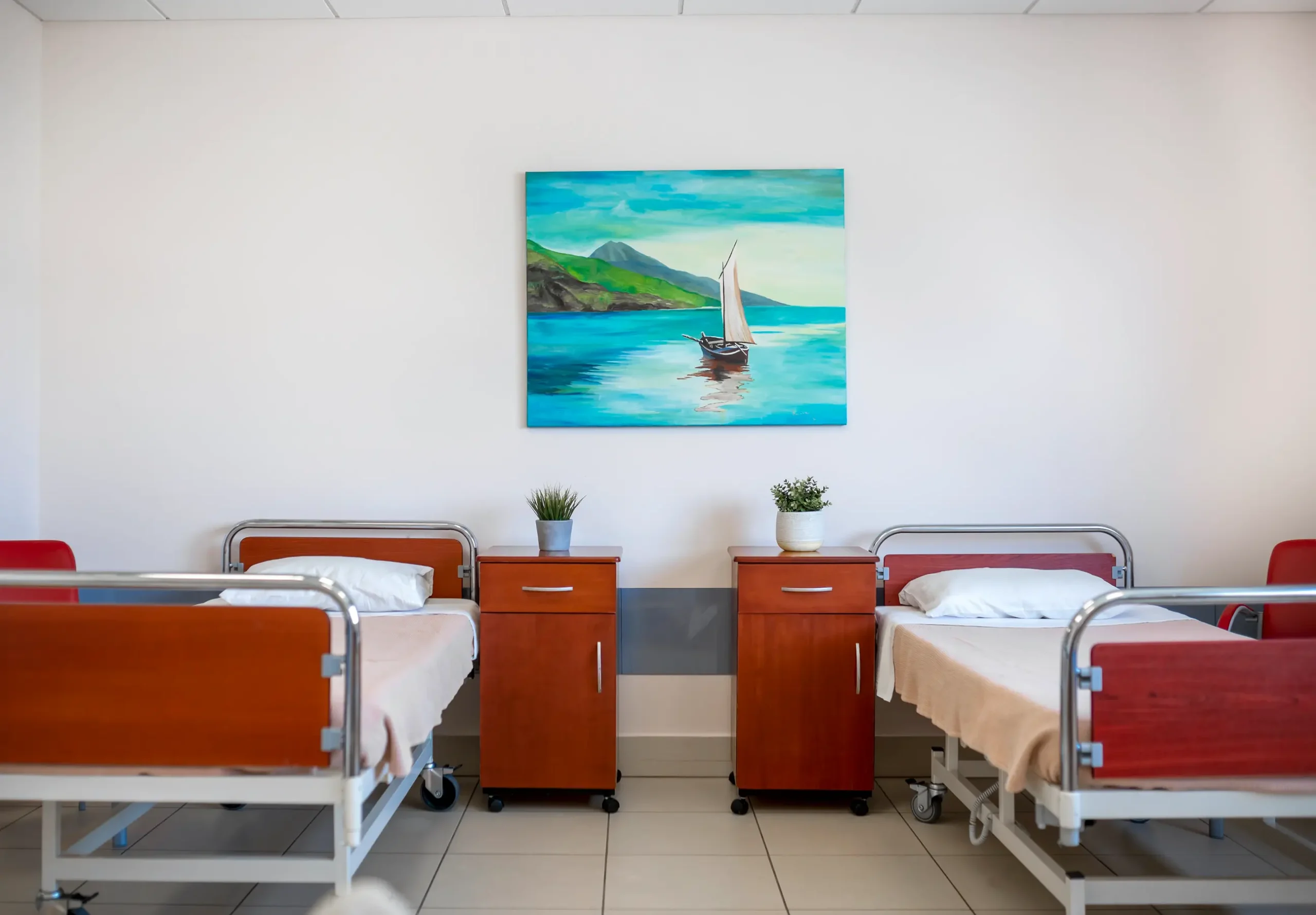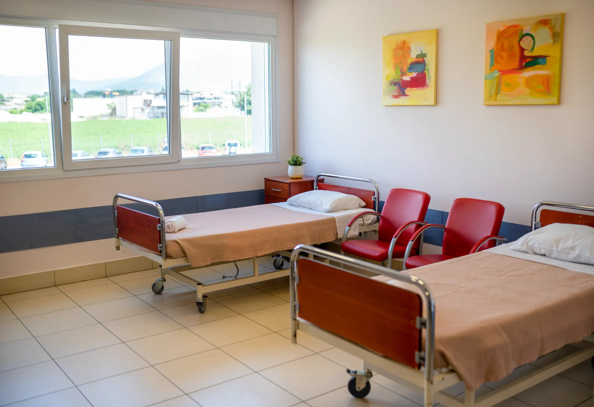 Η όμορφη θέα των δωματίων με τις καταπράσινες πεδιάδες συμβάλλει στην επίτευξη χαλάρωσης και ψυχικής ηρεμίας. H παστέλ παλέτα αποχρώσεων που έχει επιλεγεί στα δωμάτια έχει επιρροή στον εσωτερικό κόσμο του διαμένοντος, βελτιώνοντας την αντίληψη, αυξάνοντας τη θετική διάθεση και δημιουργώντας ένα υγιές περιβάλλον που ενισχύει τη θεραπευτική διαδικασία και επιταχύνει την ανάρρωση.