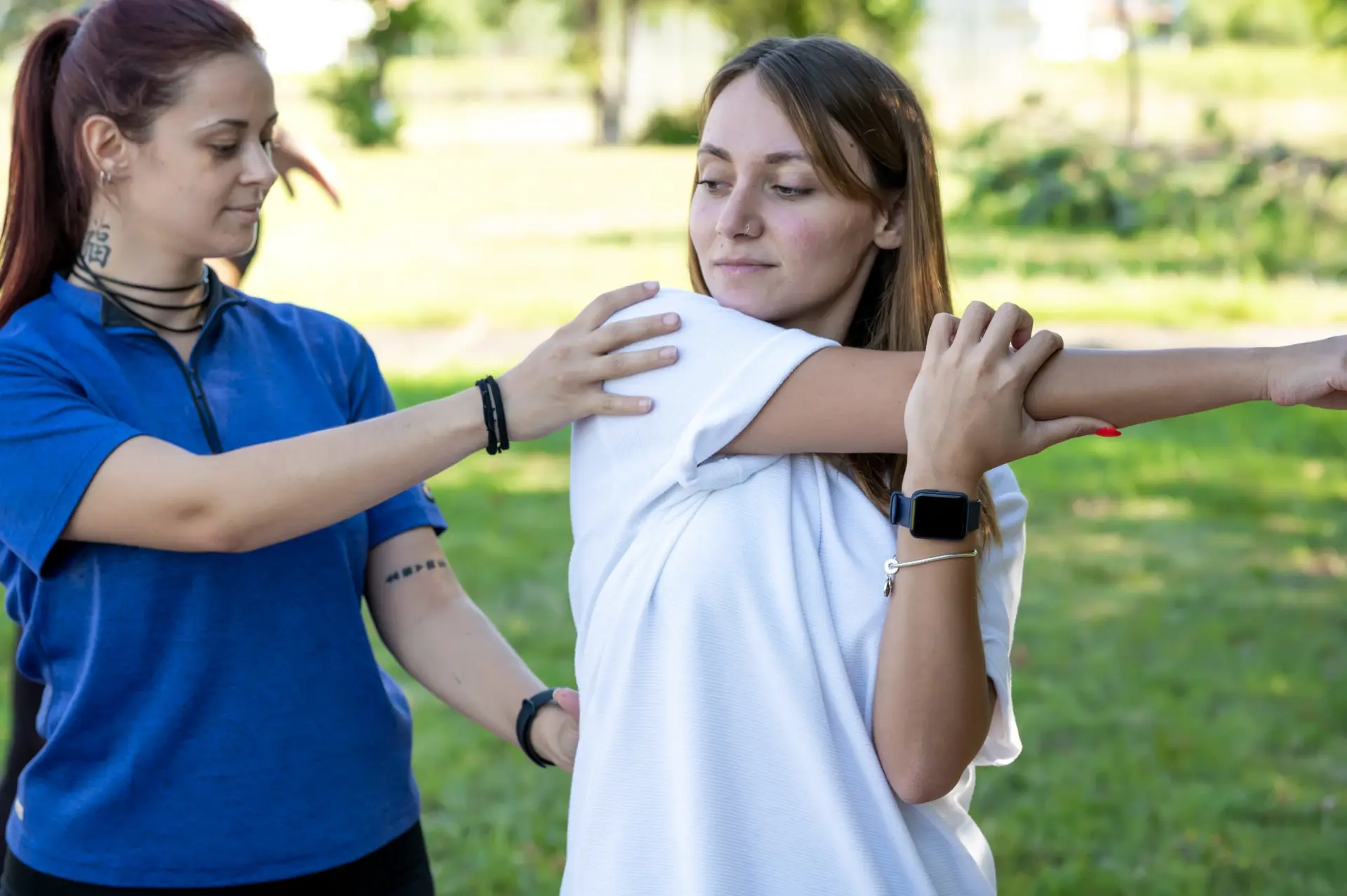 Οι εξωτερικοί χώροι στο καταπράσινο προστατευμένο περιβάλλον ενδείκνυνται για προαυλισμό, εκγύμναση, παιχνίδι και κοινωνικοποίηση των φιλοξενούμενων με ασφάλεια. Διαθέτουν όμορφα διαμορφωμένα σημεία συνάντησης, όπως το ξύλινο κιόσκι, που προσφέρουν στιγμές χαλάρωσης και επικοινωνίας. Στους εξωτερικούς χώρους διατίθεται πάρκινγκ για τους επισκέπτες και τους εργαζόμενους της Κλινικής. Το εκκλησάκι που κατασκευάστηκε από την έναρξη της λειτουργίας της ΑΓΙΑΣ ΕΙΡΗΝΗΣ αποτελεί τόπο λατρείας και προσευχής για όλους τους επισκέπτες και τους φιλοξενούμενους.
